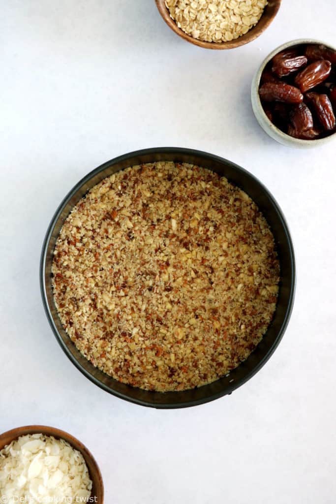 Simply pulse all the ingredients in a food processor. It must be very well mixed, but with still some texture in it. Then pour the mixture into a spring form with removable bottom in an even layer, flattening the surface with a glass or a cup if needed.