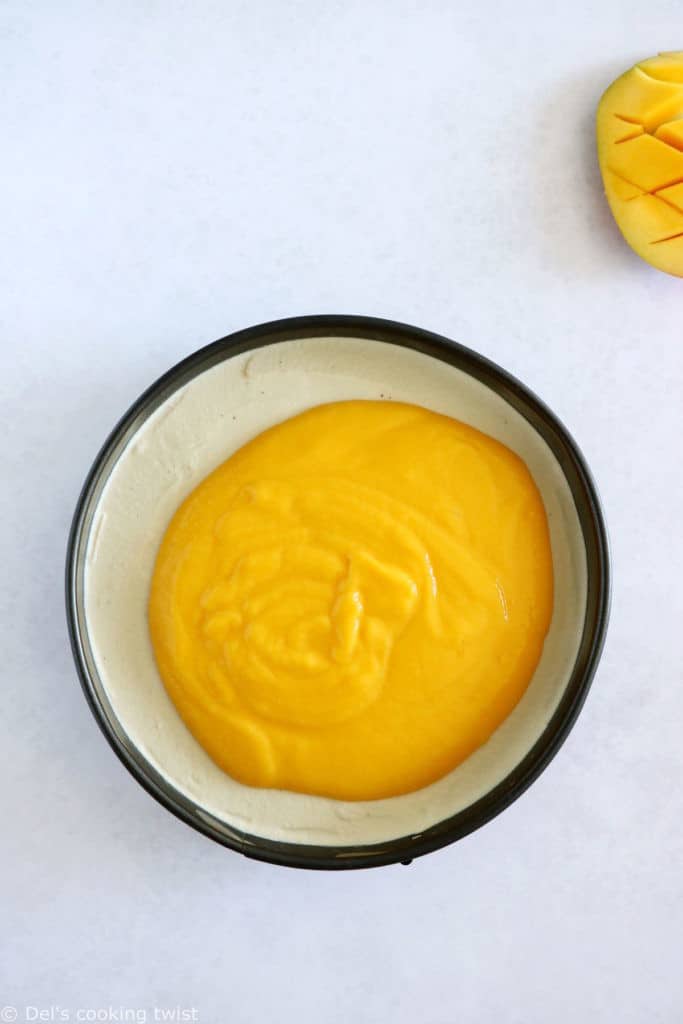 - Pour the coconut cheesecake into the springform on top of the nutty bottom in an even layer, flattening the top with an offset spatula if needed. Spread the mango puree on top and freeze until the mixture has solidified, about 4-5 hours. Let warm up at room temperature for 15-20 minutes before serving.