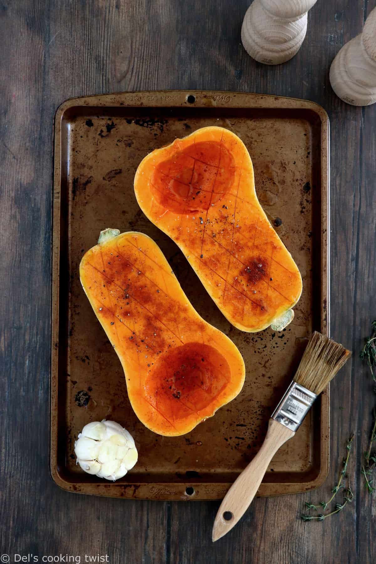 - Cut the butternut squash in half, scoop out the seeds, and score the flesh, making a cross pattern. Place, face up onto the baking sheet. Brush generously with maple syrup, and drizzle olive oil all over. Season with salt and pepper, add thyme sprigs, and turn them, face down, with thyme underneath, onto the prepared baking sheet.
