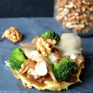 - Place a thin layer of shallots (from the lukewarm walnut sauce) on top of each Saint Marcelin tartlet and nicely display some walnuts, oyster mushrooms and mini brocoli bouquets. Cover with some lukewarm walnut sauce then warm them up a couple of minutes in the oven before serving.