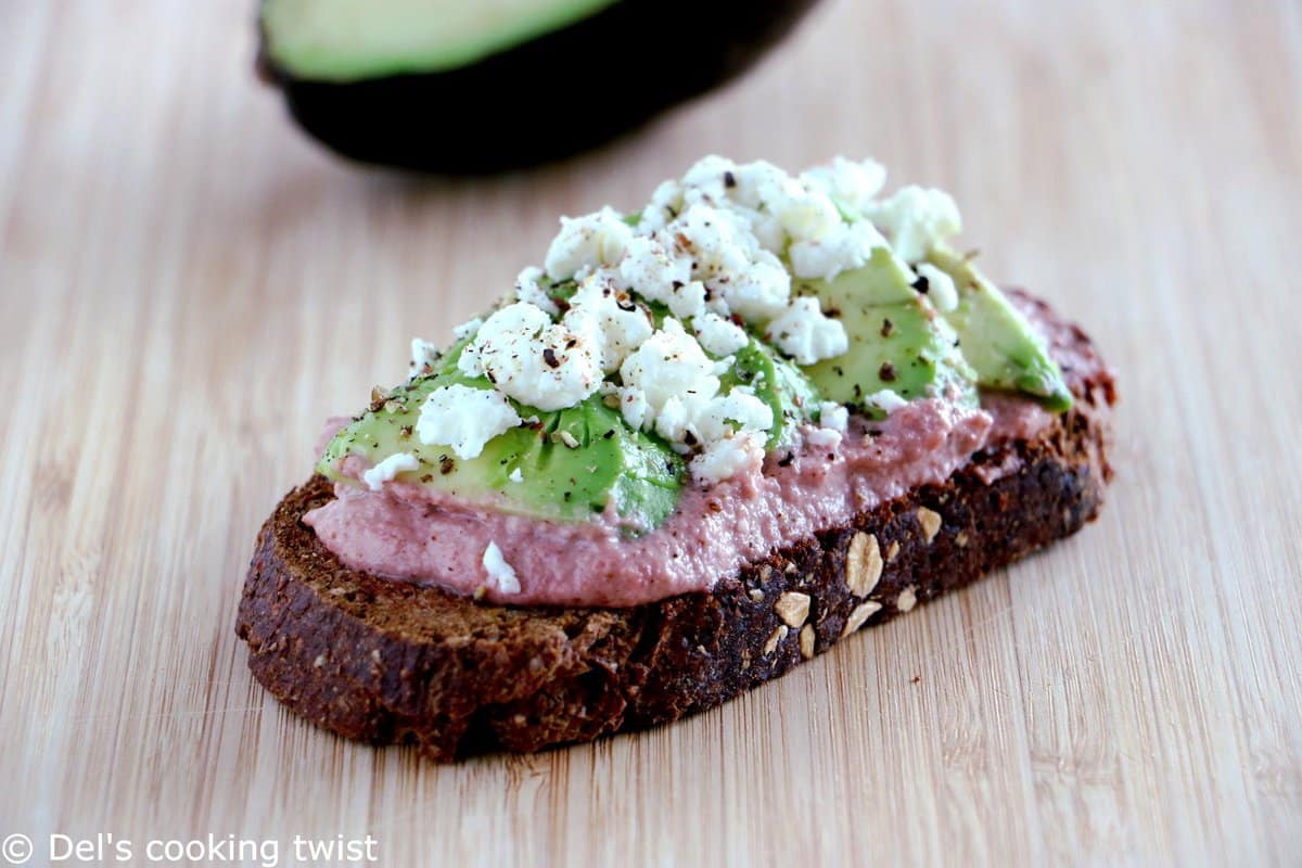 I have been eating mostly vegetarian lately, and my favorite avocado toast is indeed a vegetarian one, made with my Homemade beet pesto (that I also used previously in my Beet veggie pizza with a cauliflower crust). I usually use a dark bread such as rye bread, that I find more nutritious and with a subtle nutty taste. Add the avocado slices on top, some crumbled feta, and freshly ground pepper, maybe some pumpkin or sesame seeds if you wish, and this is it!