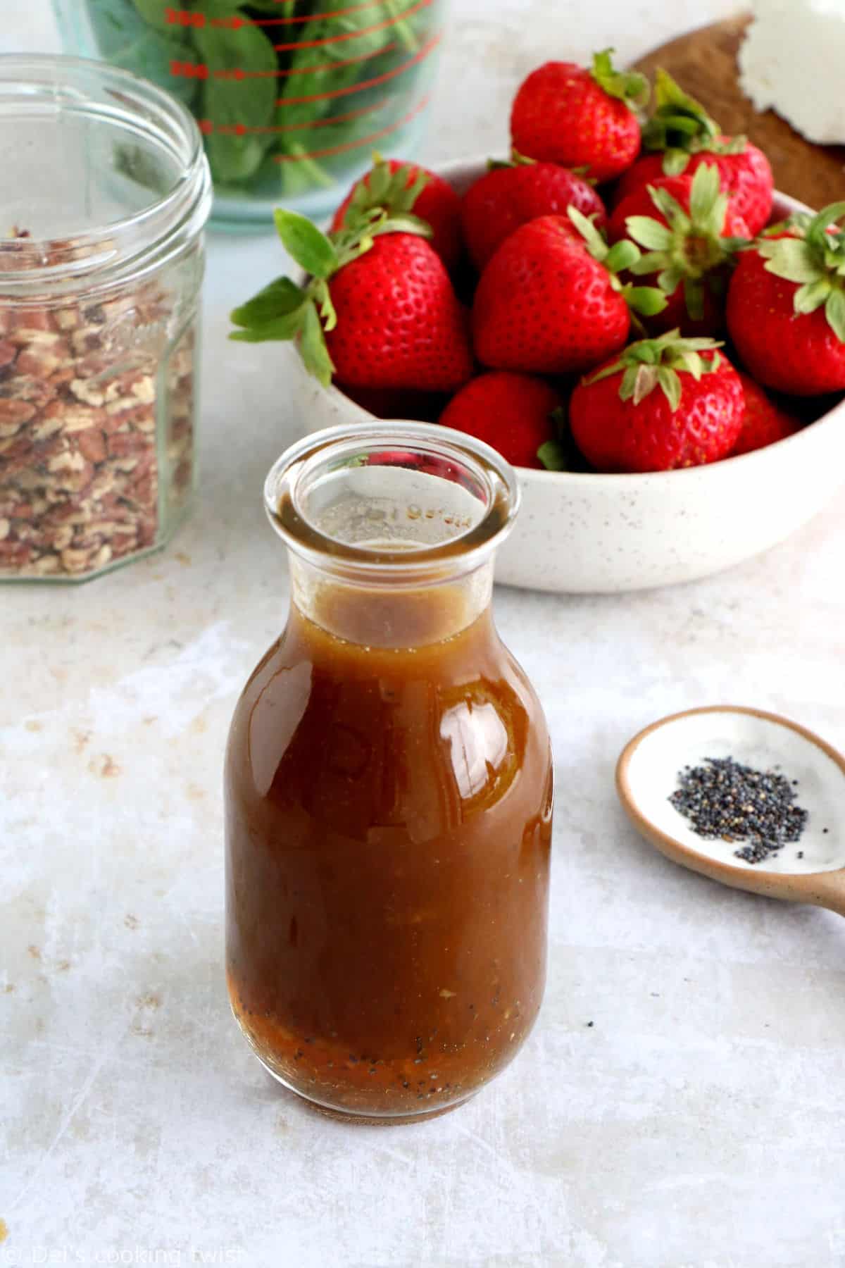 How to make the poppy seed dressing? The poppy seed dressing is what makes this spinach strawberry salad extra delicious, don’t pass on it! All you need to do is add all the dressing ingredients into a glass jar, shake it, shake it, shake it, and drizzle generously over the salad. You can also simply whisk all the ingredients in a bowl.