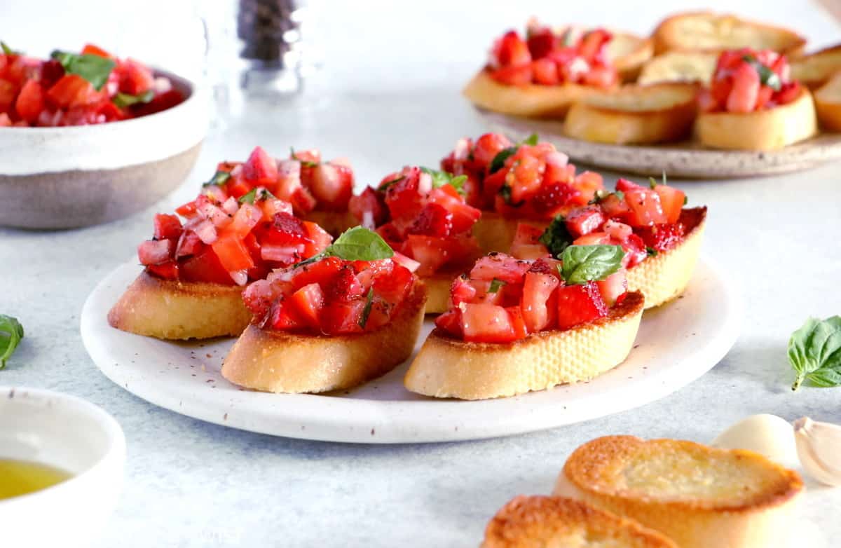 Strawberry Tomato Bruschetta is an easy summer snack appetizer. Ready in no time, this classic Italian antipasto features garlic toasted bread topped with sun-ripened tomatoes, strawberries, basil and olive oil, with a hint of balsamic vinegar. The perfect mingle food for any party or get-together.