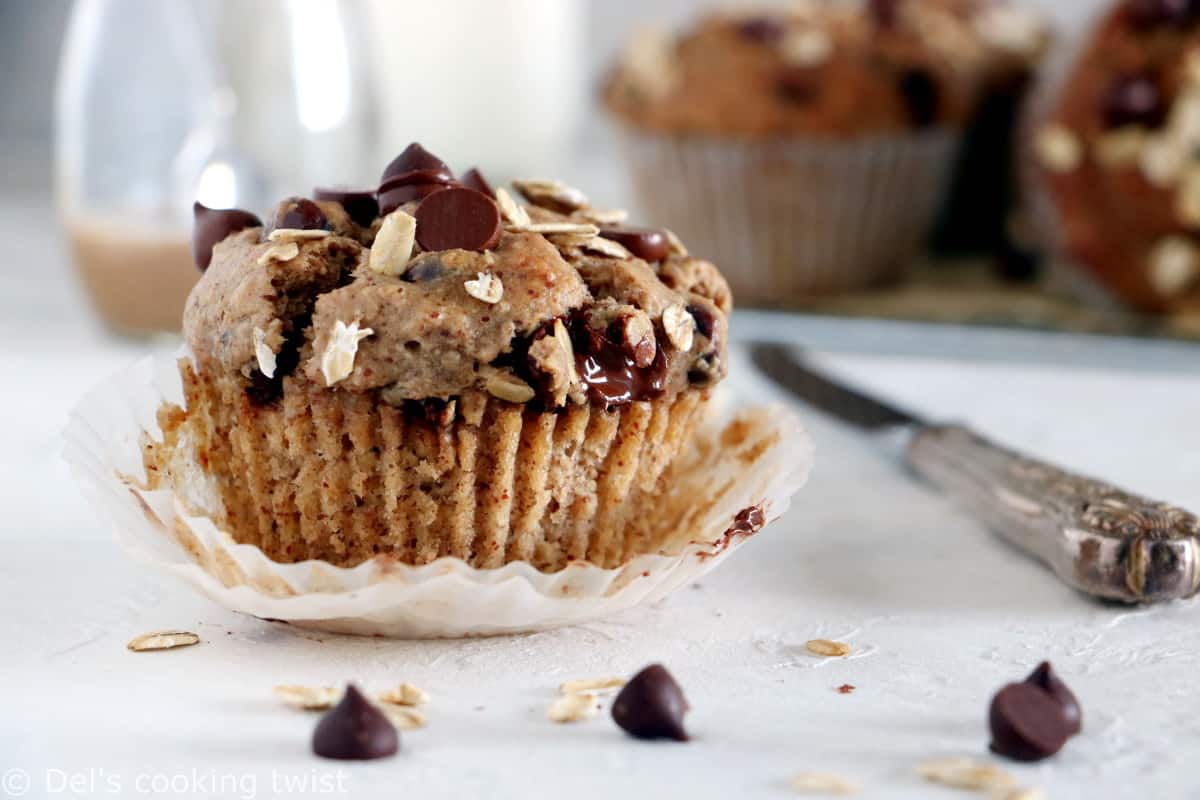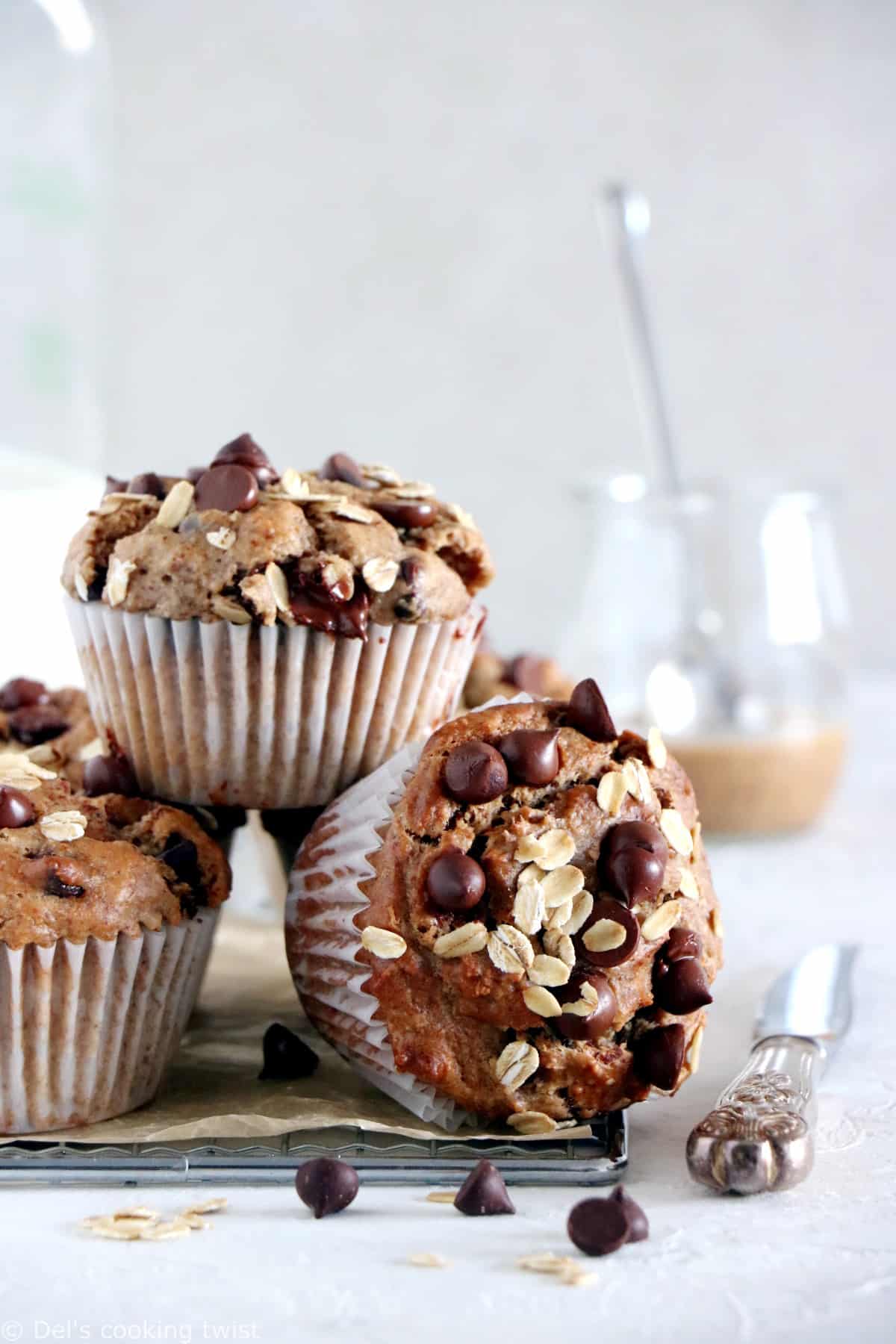 - Divide the batter evenly between muffin liners, and fill up to the top, or almost. Top with a few additional chocolate chips or oats, if desired.