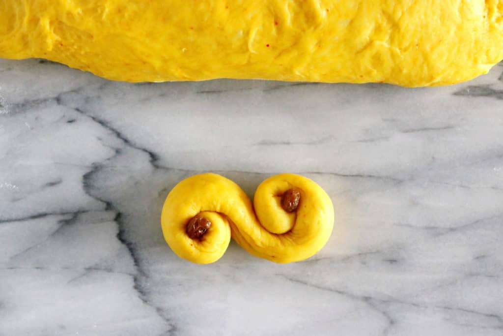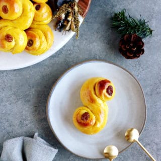 The curled saffron buns that go with this traditional celebration are S-shaped, with a single raisin in the center of each spiral. They are lightly sweet, soft and fluffy, with a vibrant yellow from the saffron-infused dough.