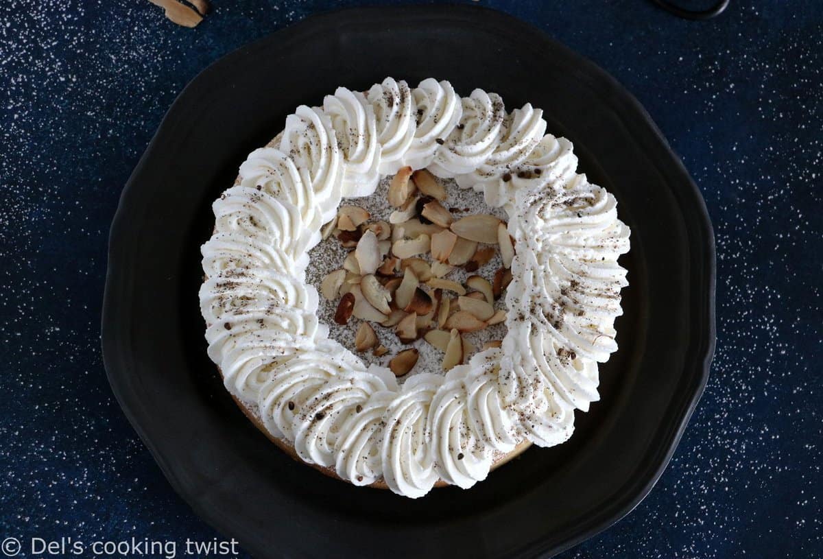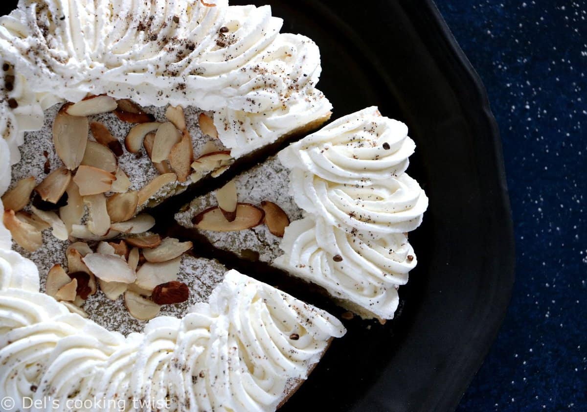 - Just before serving, whip to a Chantilly the heavy cream with powdered sugar if using. Transfer to a piping bag and pipe flower/wavy patterns onto the cake. Decorate with extra cardamon seeds and toasted almonds.