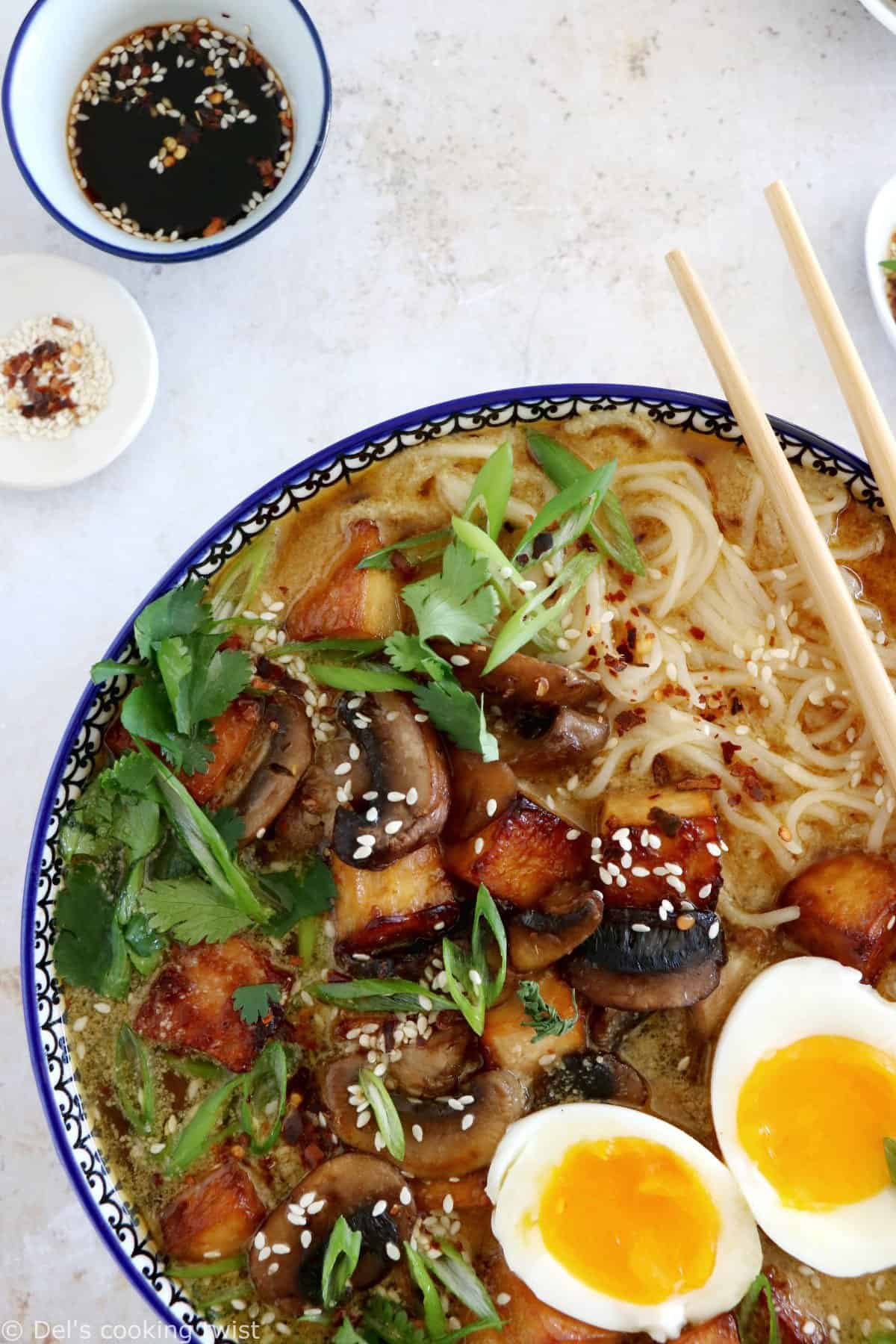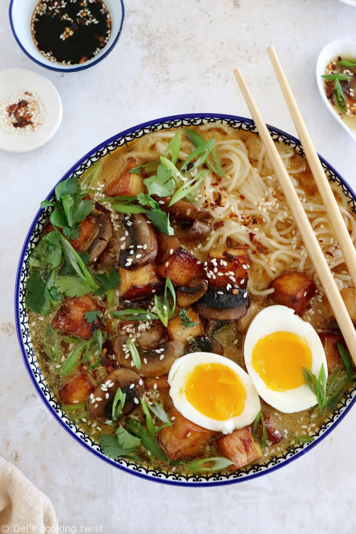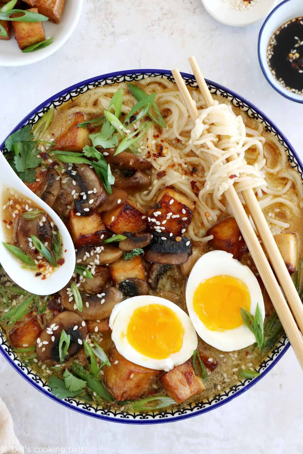 Here’s a delicious tahini miso ramen with crispy tofu, sautéed mushrooms, soft boiled eggs, and a broth loaded with umami and slightly spicy flavors. This vegetarian ramen recipe makes a cozy and comforting Japanese noodle soup.