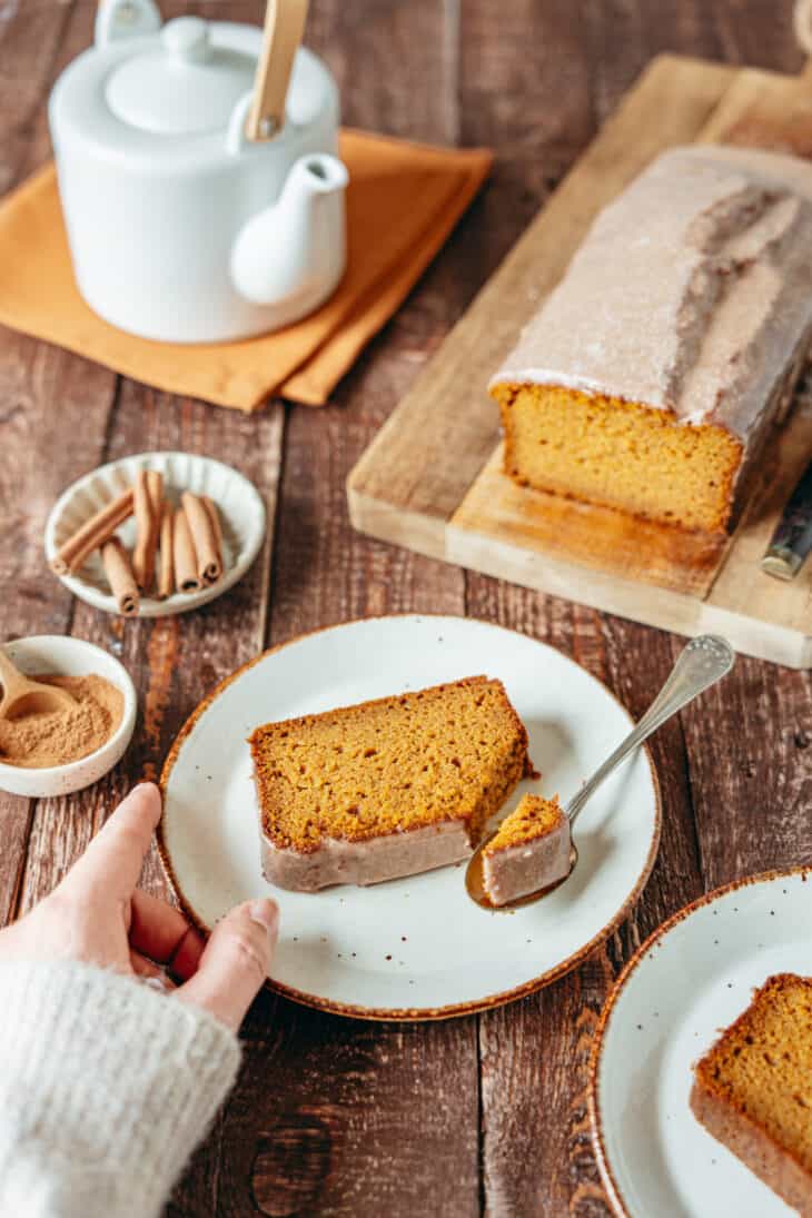 I love this pumpkin bread plain, or with a simple cinnamon icing on top. But there are many other ways to pimp up your bread. You can add some chocolate chips, pecans or walnuts in the batter. You can also top the pumpkin bread with a maple icing instead of the cinnamon one, or with a streusel topping, like in our cinnamon swirl coffee cake.