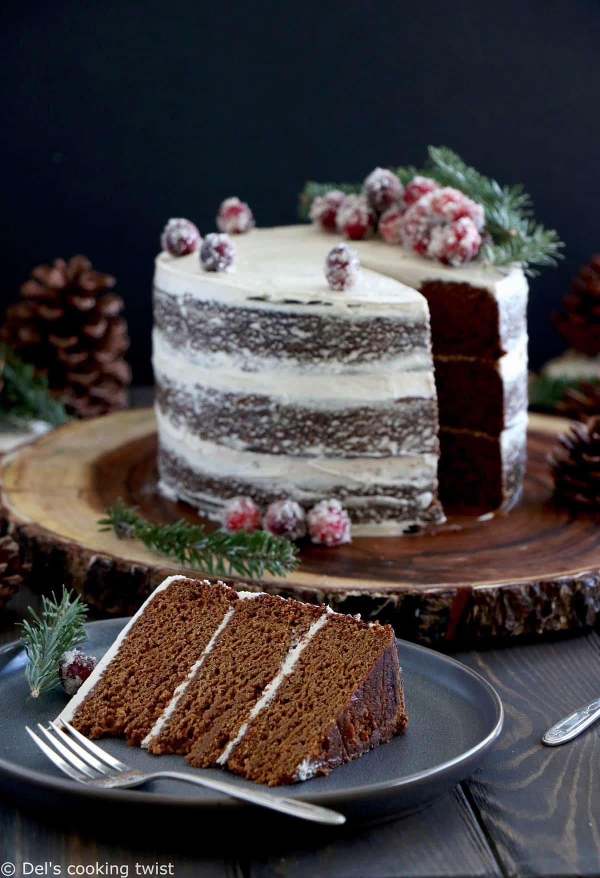 The final touch are the sugared cranberries. It’s mostly for decoration here, so you should see that mostly as an optional part of the recipe. There is no necessity of doing it, especially if you don’t find cranberries easily, depending on where you are (they are everywhere in the US but I know it’s not the case everywhere). Alternatively you can also use gingerbread cookies to decorate! Your naked cake will be high and rather thick, so you will easily make 12-15 slices. I hope you will have fun baking and I wish you a Happy Holidays!