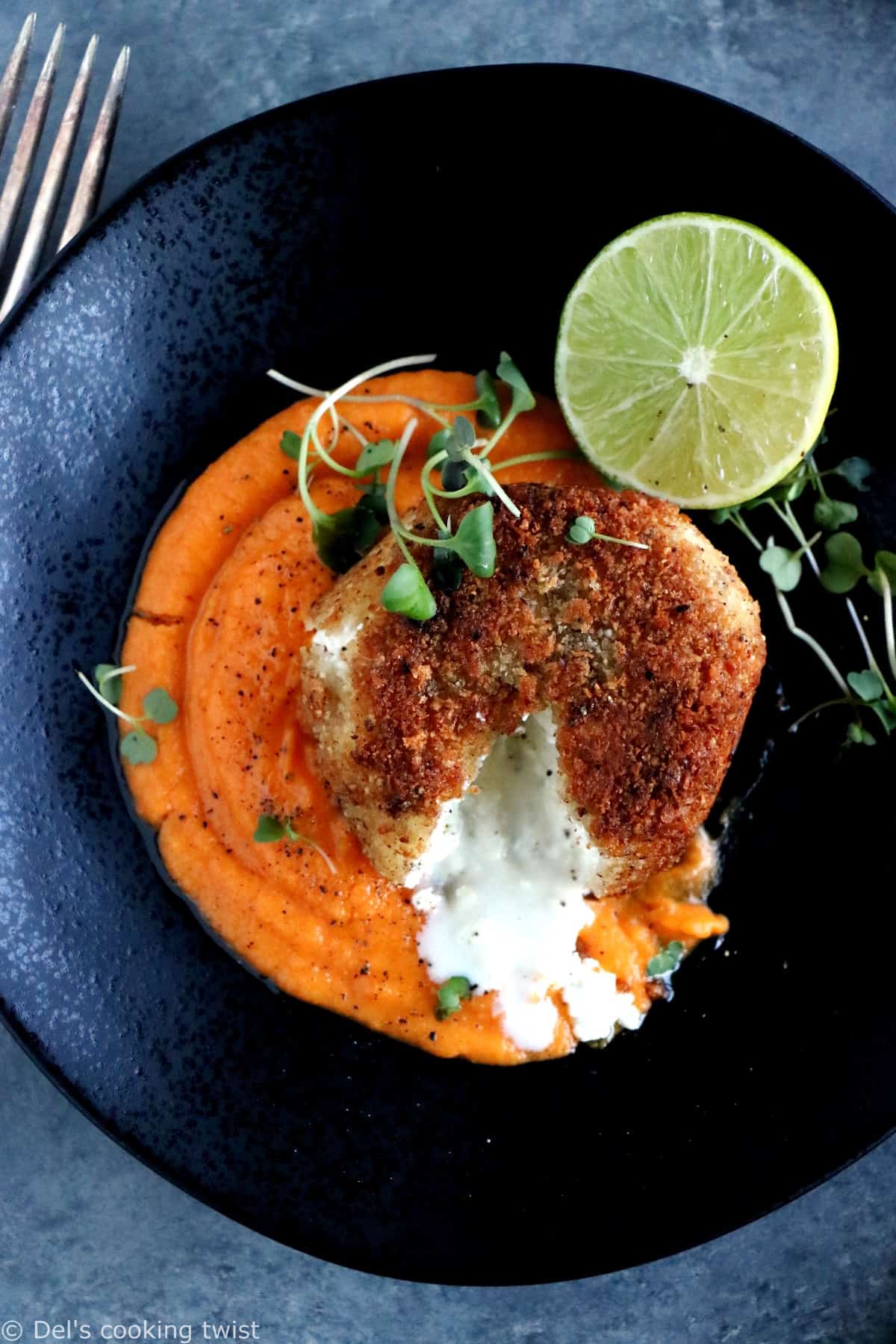 - Serve the goat cheese on a bed of orange puree and garnish with a few microgreens. Add a fresh squeeze of lime juice over the puree just before serving (optional).