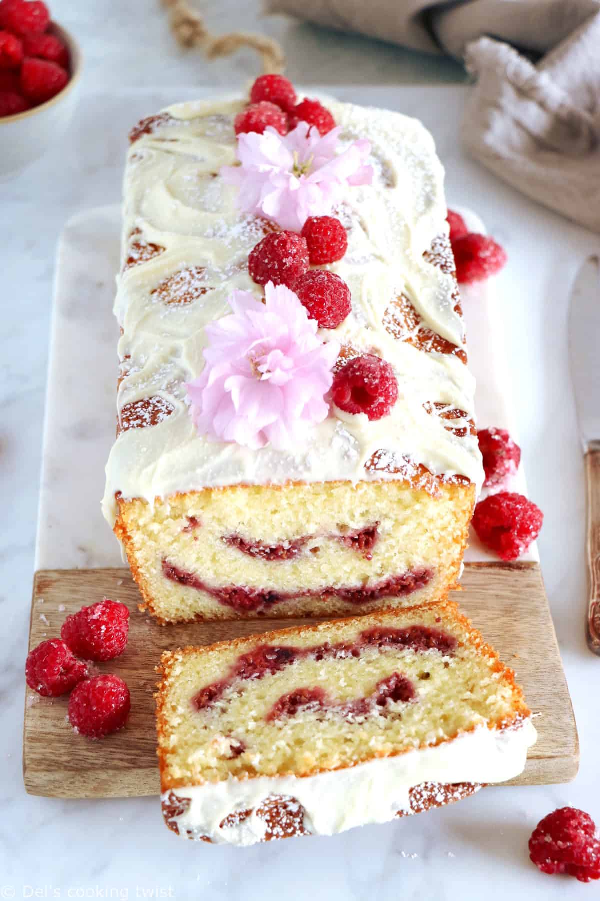 Delicious and easy to make, this white chocolate raspberry marble cake is filled with jammy raspberry swirls and topped with a generous and sweet layer of white chocolate.